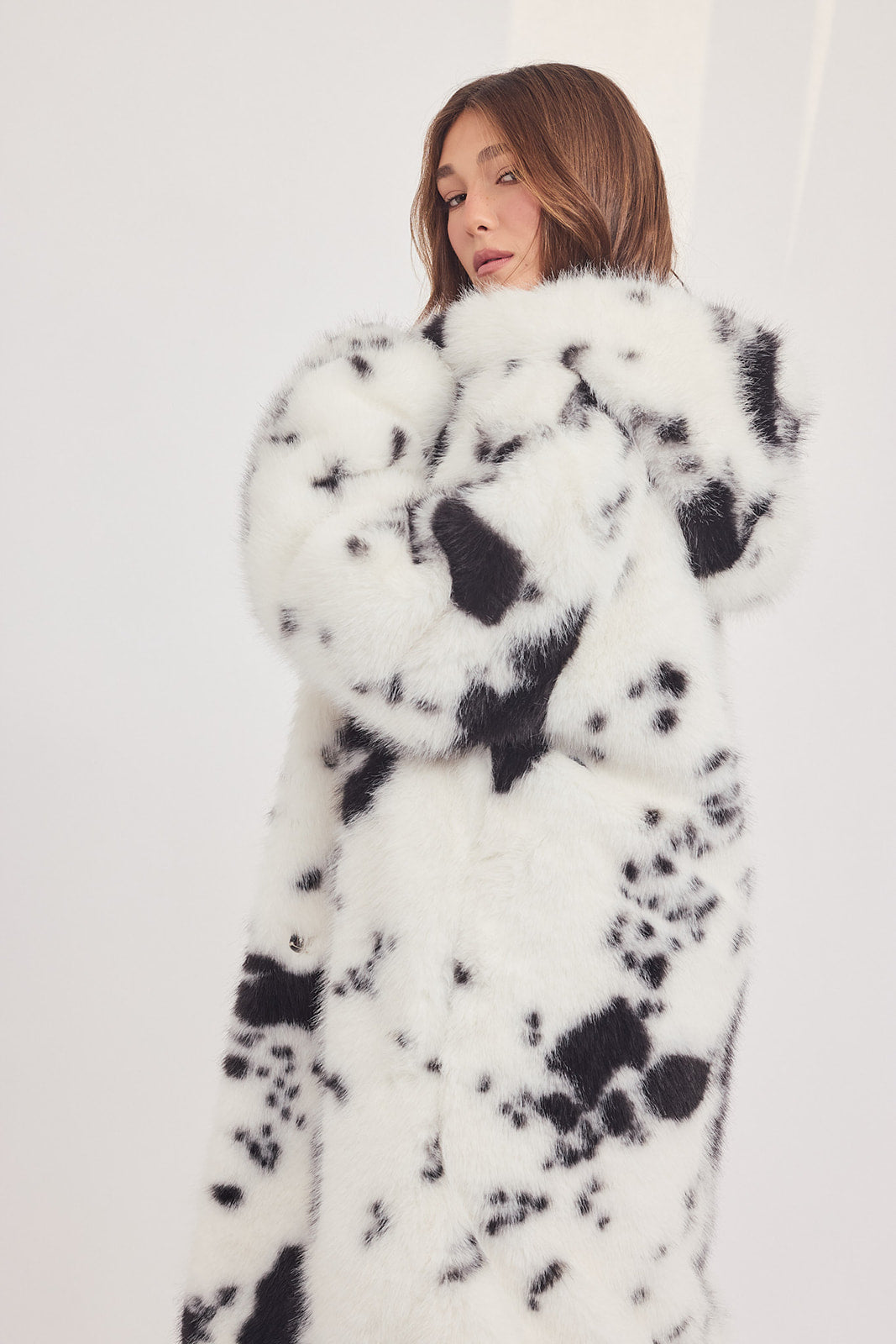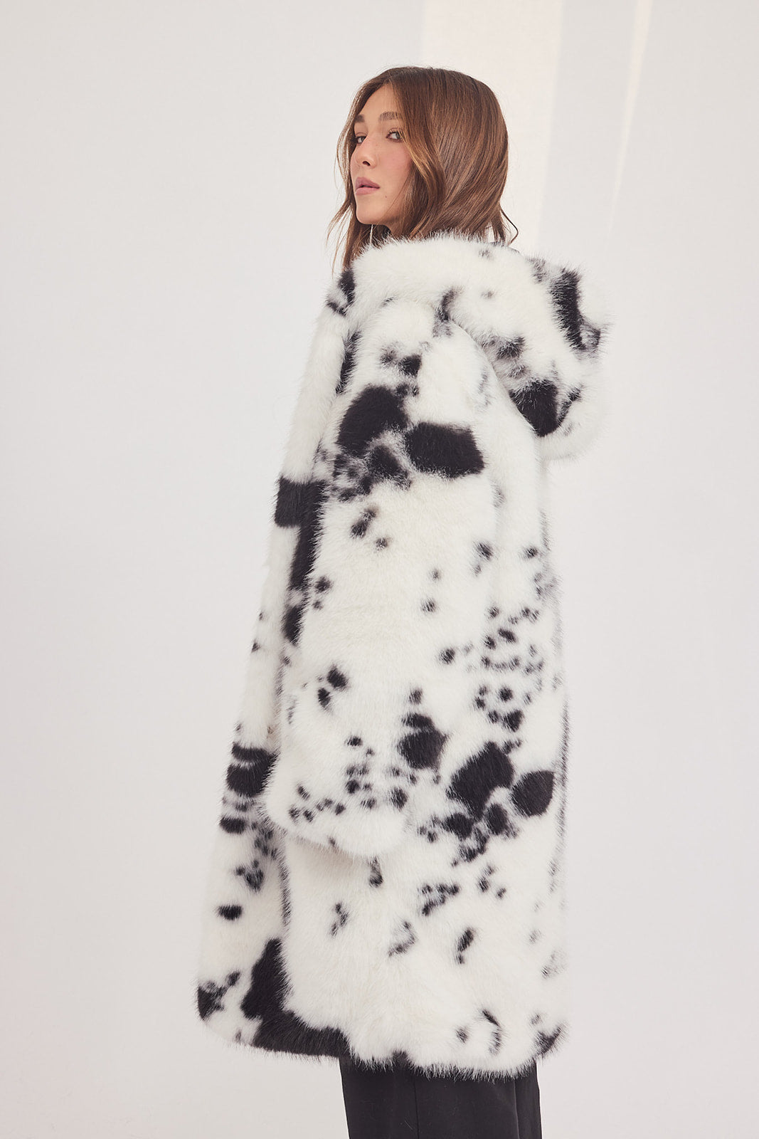 מעיל פרווה מלאכותית עם כובע בהדפס פרה