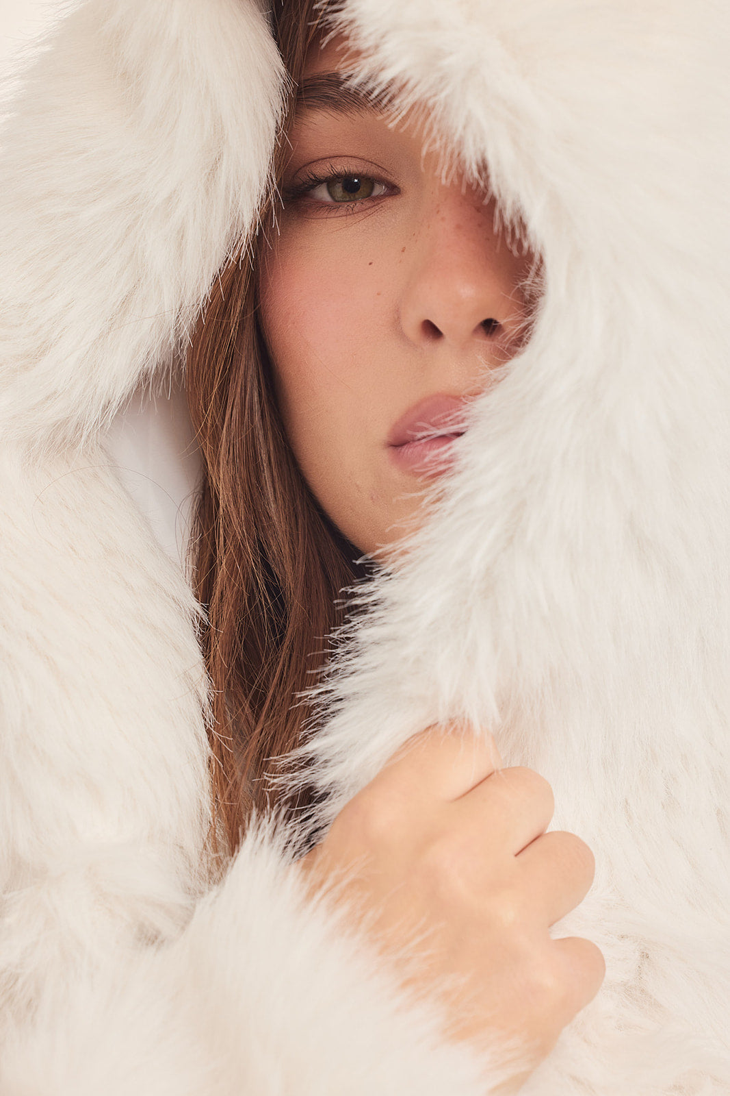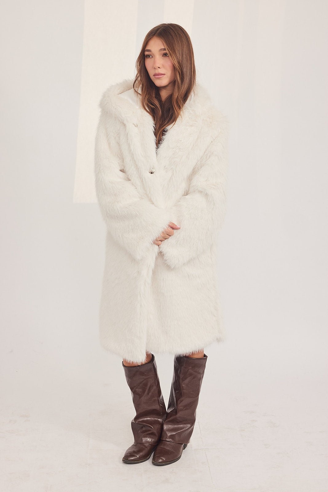 מעיל פרווה מלאכותית עם כובע בצבע לבן