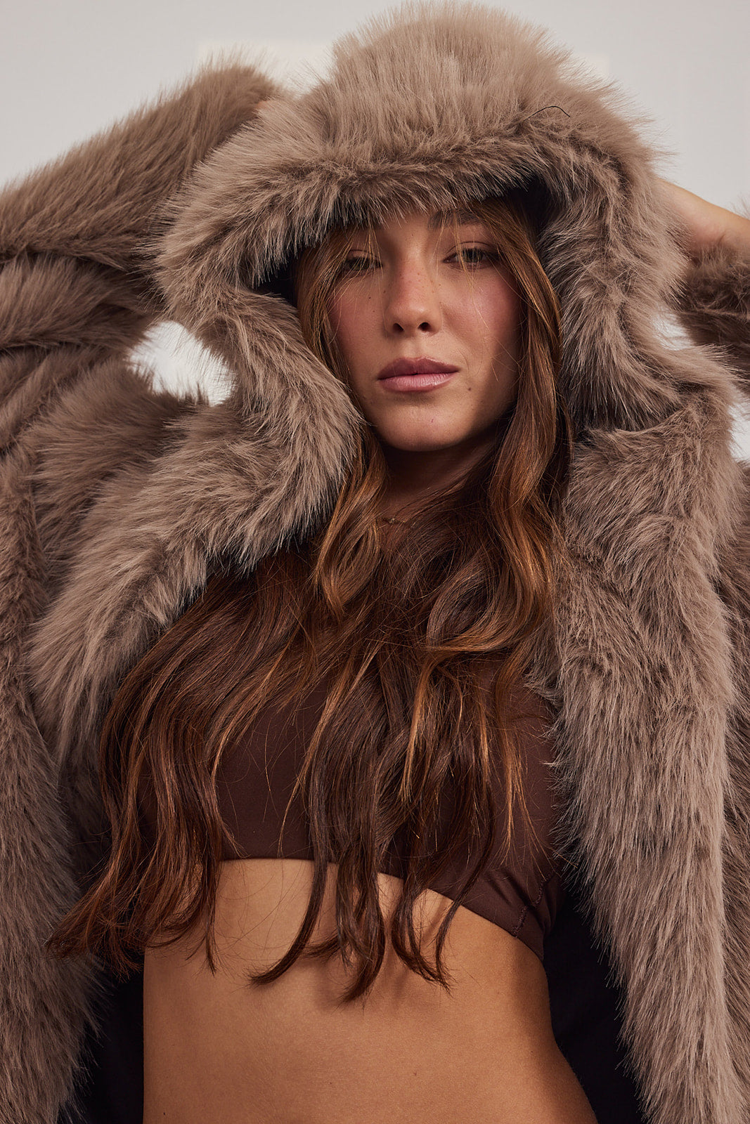 מעיל פרווה מלאכותית עם כובע בצבע חום